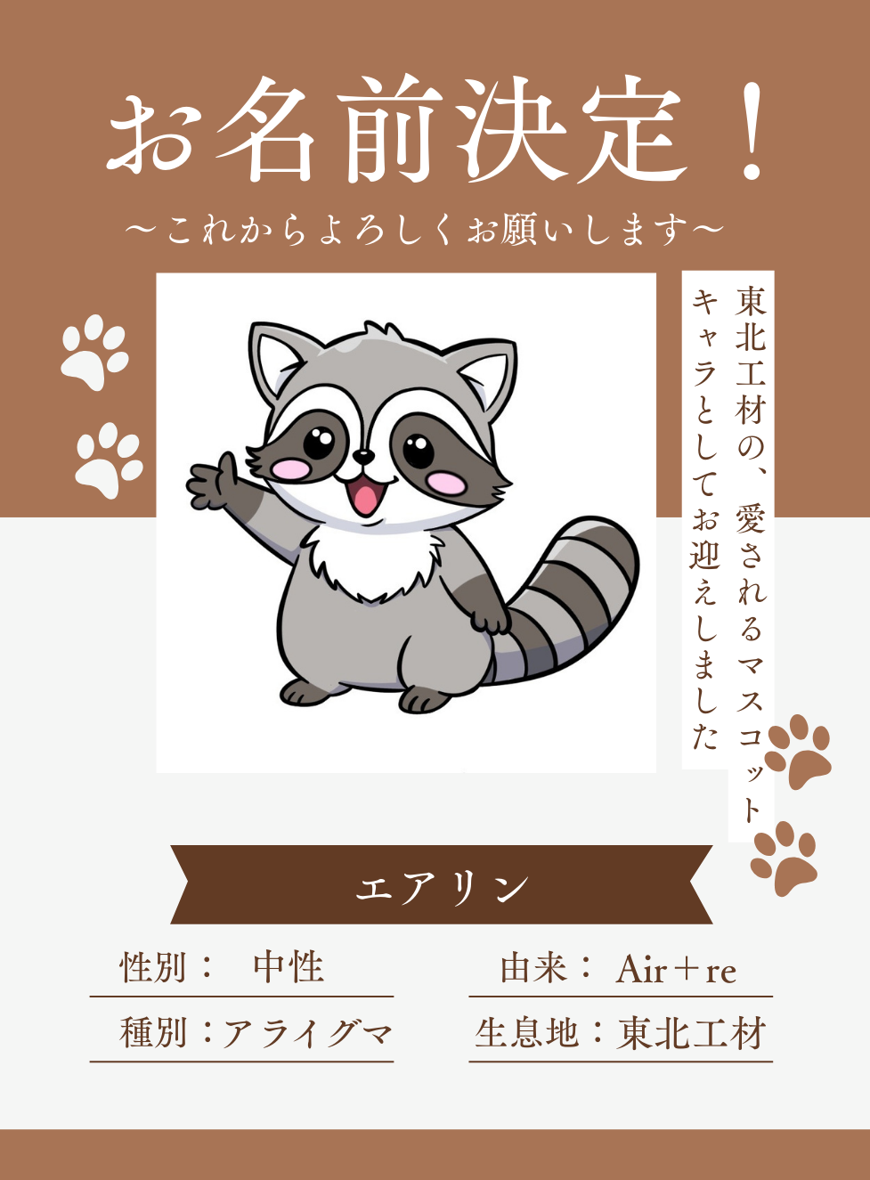 東北工材のマスコット、アライグマの「エアリン」と申します。