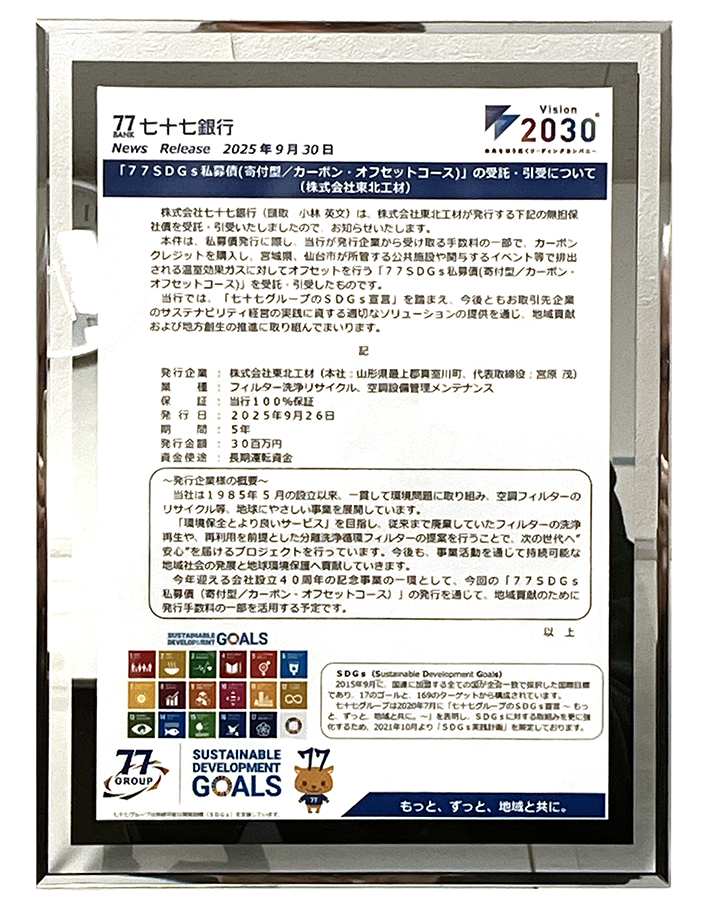 七十七銀行様の「77SDGs私募債カーボン・オフセット型」採択・発行していただきました